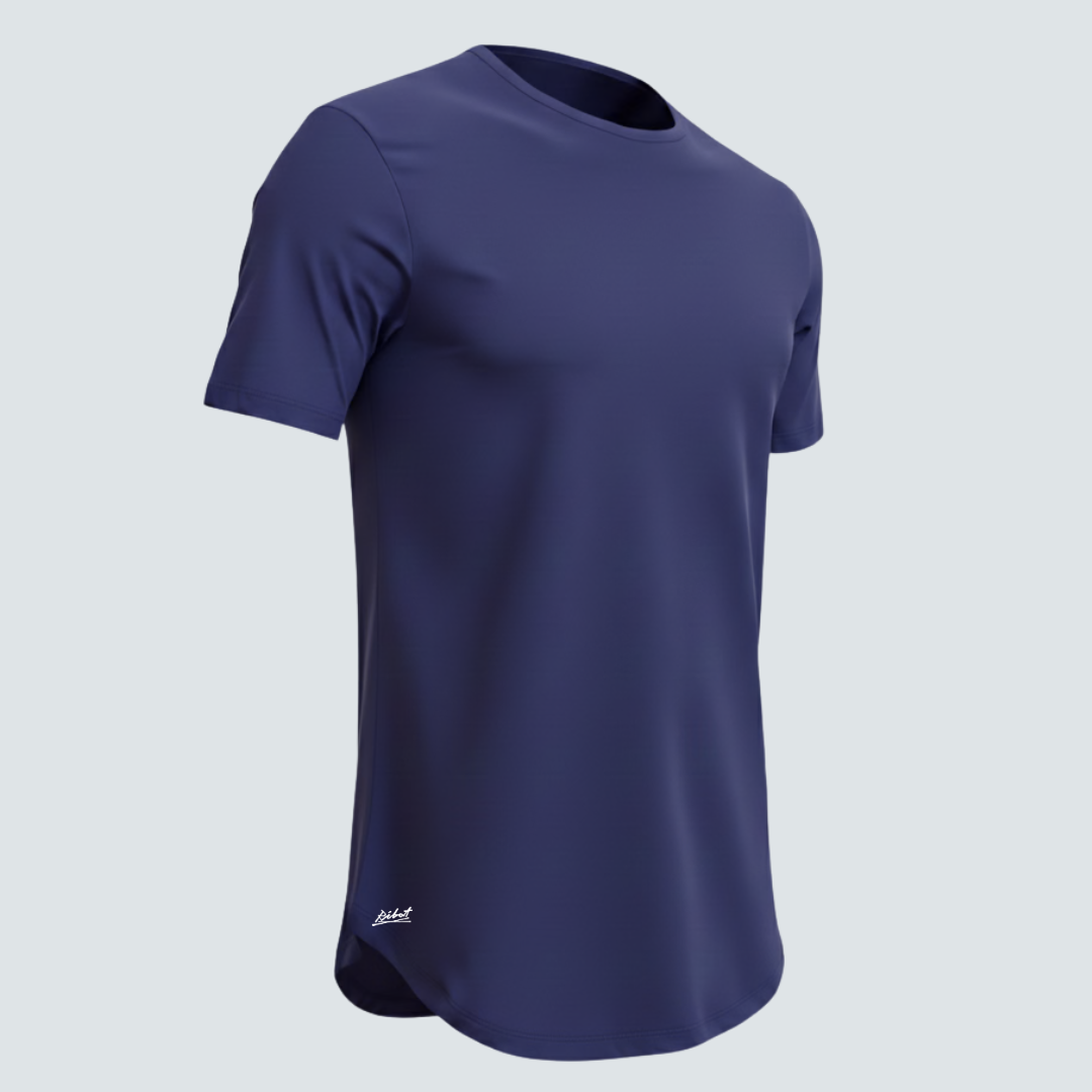 Camiseta básica Regular Fit, ajustada en hombros y torso suelto, manga ajustada, cuello asentado, ruedo con corte curvo.