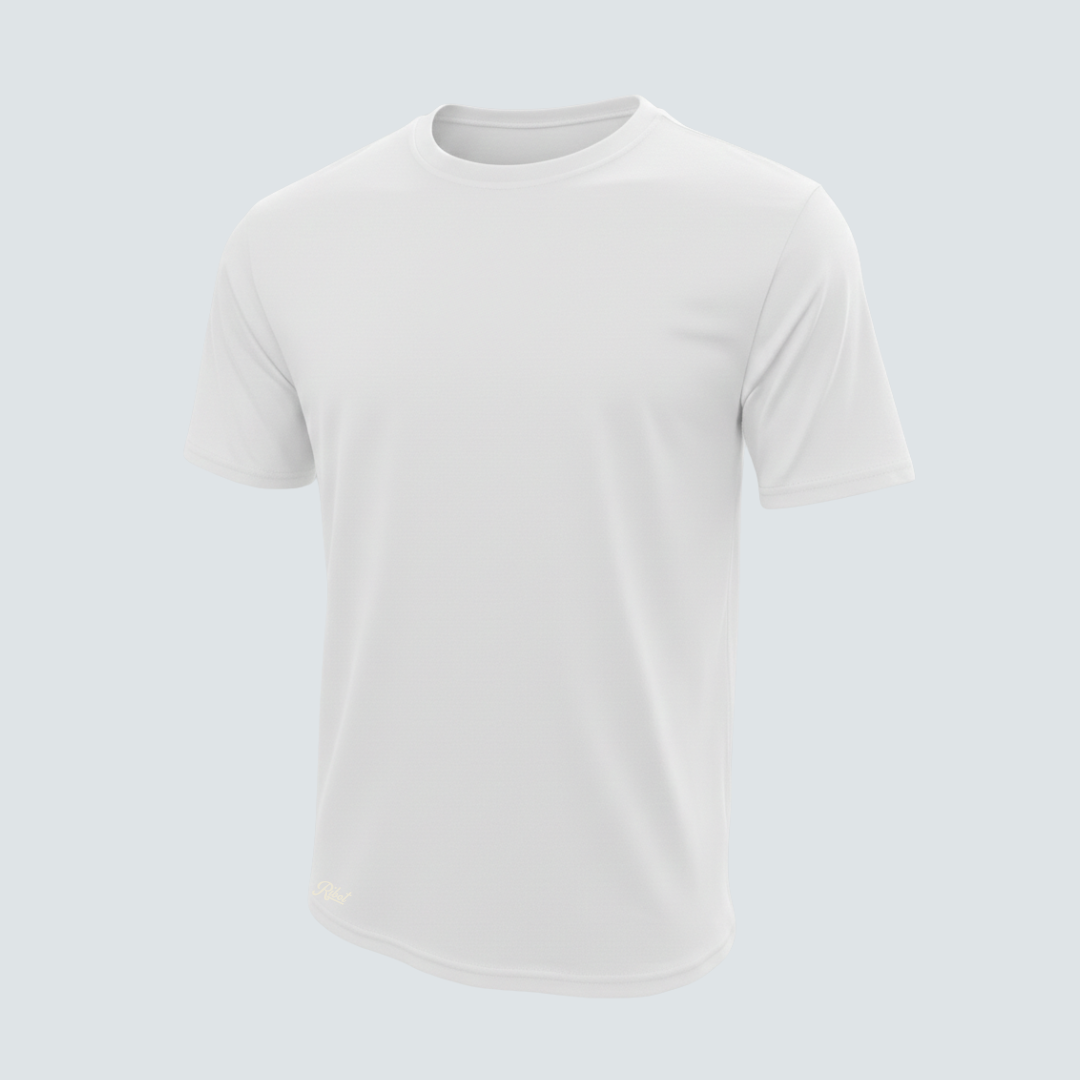 Fabricada 100% en algodón peruano de alto gramaje 180 g/m², cuello en rib de 1.2 cm, ruedo recto.